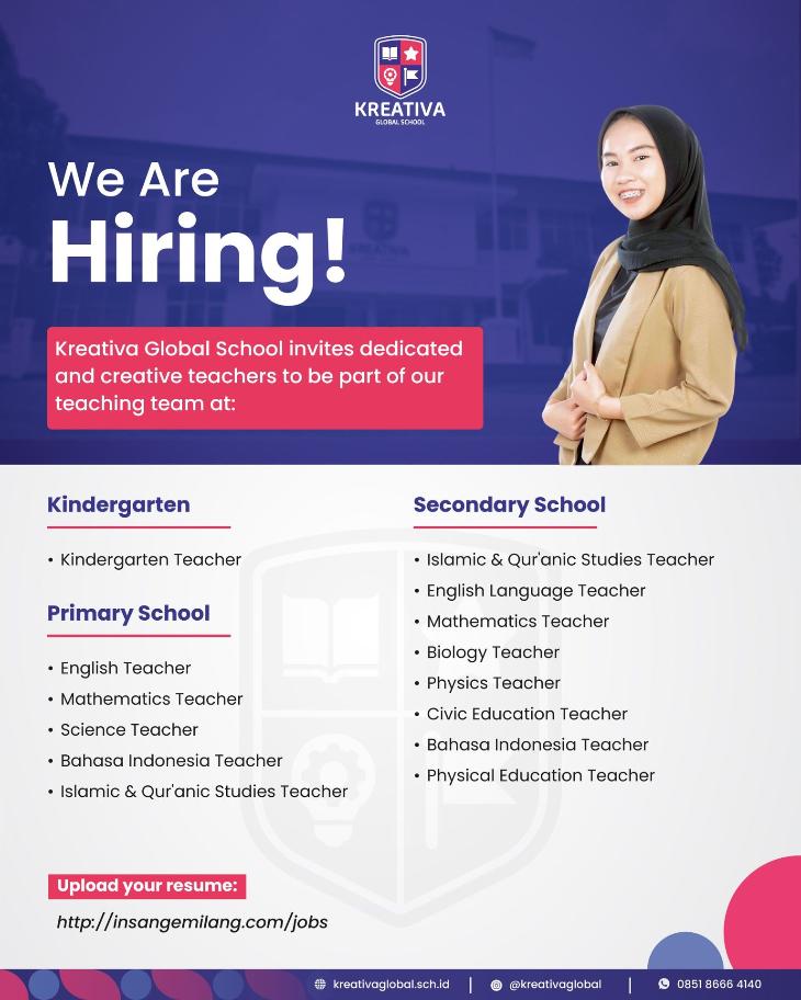 Kreativa Global is an international Islamic school, from Kindergarten, Primary, Secondary, up to Junior College, with the Cambridge curriculum, IB approach, and Islamic values. It nurtures creativity, critical thinking, and strong moral character from an early age. Supported by modern facilities, qualified teachers, and English as the language of instruction, we are now opening a position for a Civic Education Teacher (Secondary).